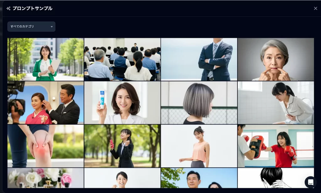 大量のサンプル画像/動画と、実際に使用されたプロンプトを確認いただけるので、初心者の方でも簡単に生成AIを活用できます。
