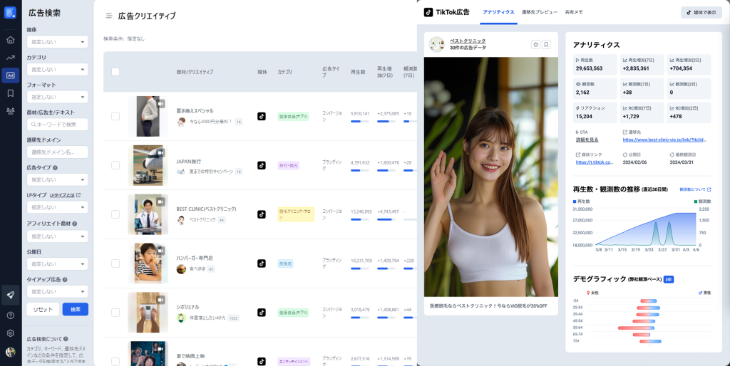 ・再生数、再生増加数、リアクション数や広告タイプなどの高精度な検索