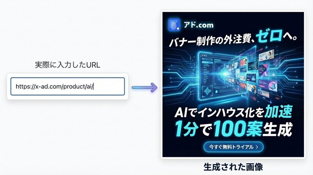 プロンプト入力一切ナシ、商品やサービスのURLを入力するだけで”勝てるバナー広告”が瞬時に自動生成されます。