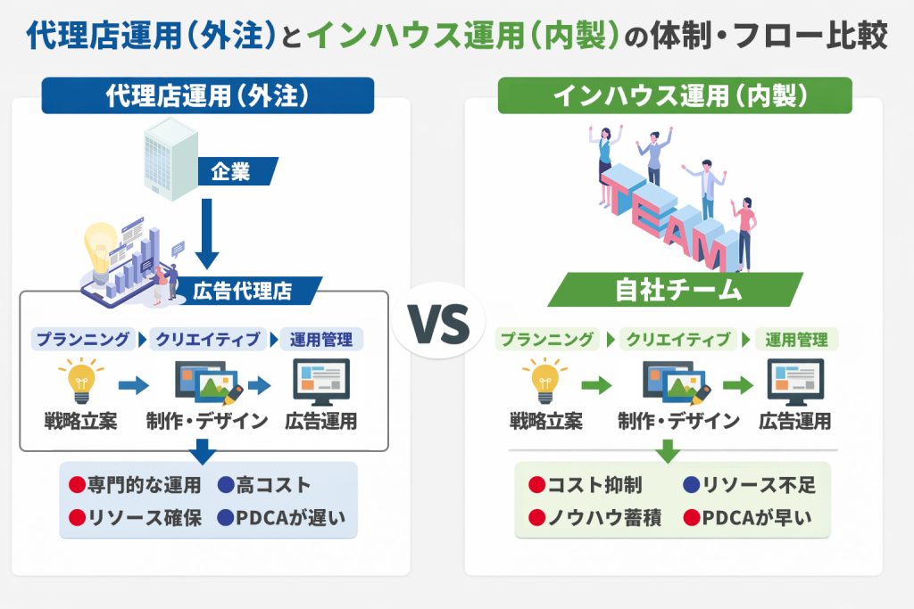 広告運用のインハウス化とは、これまで運用代行業者(広告代理店など)や制作業者に外注・依存していた広告運用業務を、自社内(インハウス)だけで実行できるようにする体制のことです。