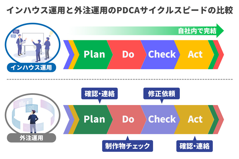 広告制作から運用をインハウス化することで、意思決定から実行までの時間が短縮され、PDCAサイクルを圧倒的に加速させることができます。